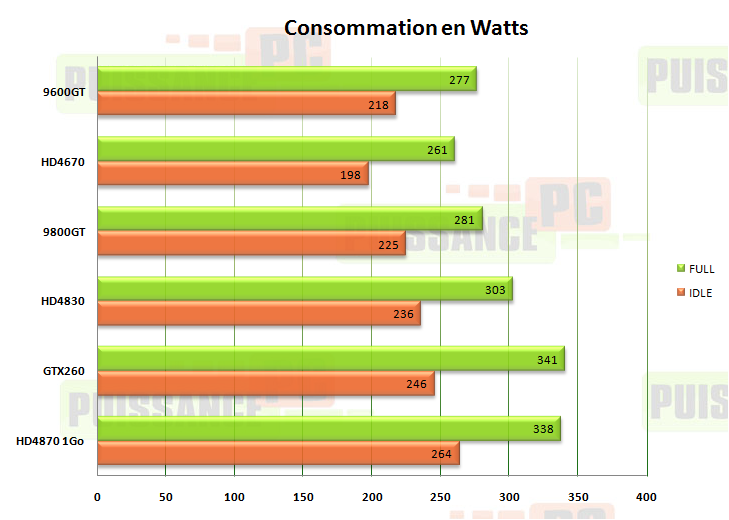 La HD4670 est celle qui consomme le moins d’électricité, un résultat prévisible le bus PCIExpress 2.0 seul suffisant à l’alimenter. La HD4830 consomme plus que la 9800GT, surtout en full, tandis que la HD4870 fait un peu mieux que la GTX260. Les écarts entre les cartes de même gamme restent cependant modérés, et il faut garder à l’esprit que la consommation globale relevée est fortement impactée par l’usage d’un Phenom overclocké, qui consomme énormément. Ceci étant dit, il est temps de passer à la conclusion!