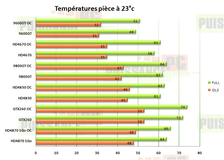 Voici les températures de nos cartes avec leur propre système de refroidissement, sauf pour la 9600GT pour laquelle nous avons remplacé le radiateur full passif d’usine par un Duorb. Elles ont été relevées lors de 20 minutes d’idle et après 10 minutes de Warhead en détails maximum et avec filtres. C’est Rivatuner qui nous a permis de les relever, donc elles correspondent à ce que les sondes renvoient comme information..