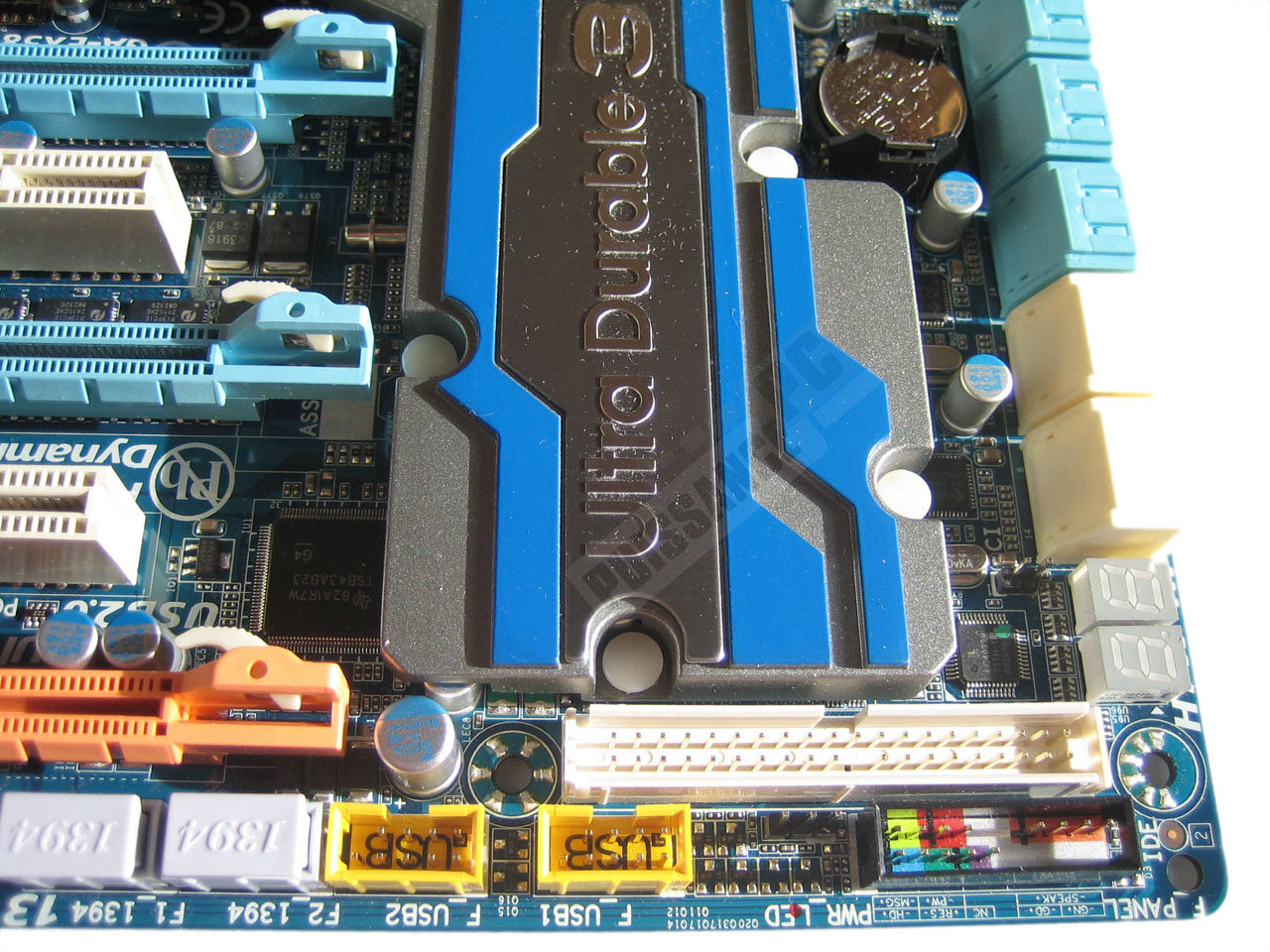 Sur le cliché de droite, on distingue les 2 connecteurs internes firewire ainsi qu’USB et le panel de raccordement pour le boitier. Pas de smart ou Q-Connector ici et c’est bien dommage, Gigabyte a toutefois différencié via des couleurs les différents éléments ce qui peut s’avérer également pratique. Au bout de la carte, on retrouve à l’instar du modèle DFI un afficheur à LED bien pratique au demeurant pour diagnostiquer un problème au boot.