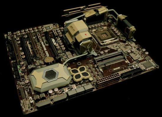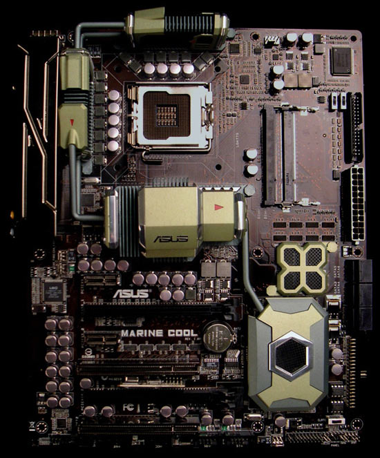 Asus a présenté un modèle de carte mère pour processeurs LGA775. Que peut bien donc présenter cette carte nommée "Marine Cool" : une photo imprimée sur le layout des YMCA qui chantent "In the Navy" ? Une image d’Arrakys le mérou ? Pas du tout en fait le style est très spécial comme vous allez pouvoir le découvrir en suite de news, avec un radiateur au look particulier, une plaque céramique qui recouvre la face arrière de la carte, ou encore l’usage de mémoire SODIMM via deux canaux. Ce n’est qu’un prototype mais il éveille bien la curiosité. Images libérées des flots par Anandtech.