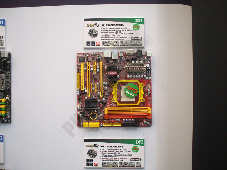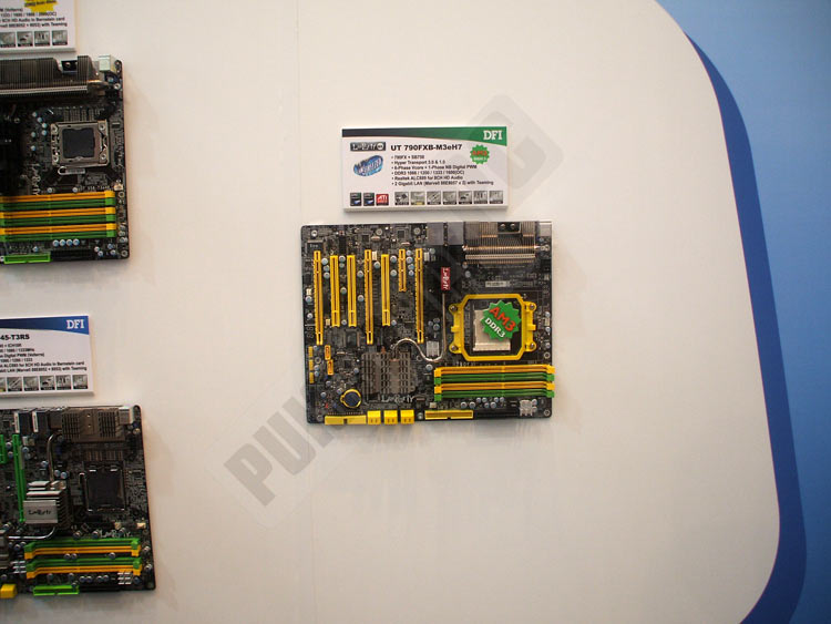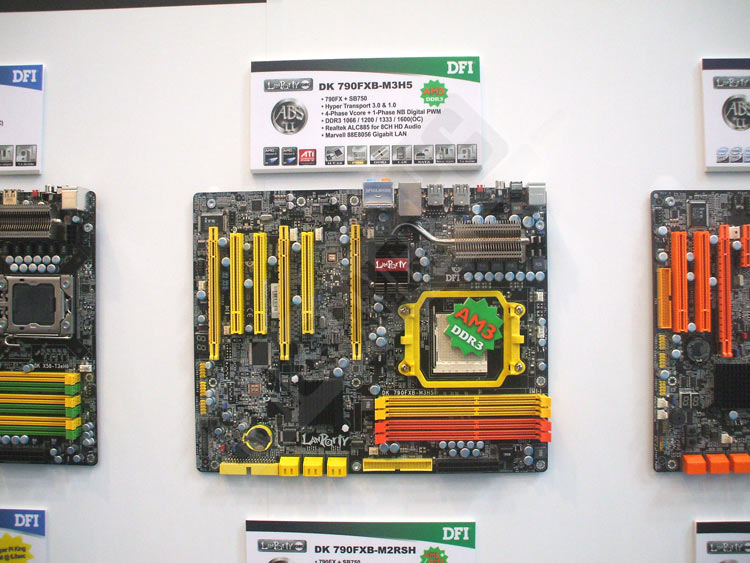 DFI donc propose sur son stand tout son contingent de cartes mères, mais toutes sont déjà connues et même commercialisées, sauf trois petites nouvelles qui viennent renforcer les rang d’AMD. Reste à voir si ce retour fulgurant sur le X58 augure d’un tel succès chez AMD. Voilà donc les trois cartes purement AM3, donc exit la DDR2. Deux cartes ATX sont basées sur le 790FX+SB750, et ne s’adressent pas aux mêmes personnes puisque la DK 790FXB-M3H5 est prévue pour la vente de masse tandis que la UT 790FXB-M3eH7 est plutôt orientée overclocking et power users. la dernière carte est une carte au format µATX équipée du 790GX+SB750 : c’est la JR 790GX-M3H5. C’est tout, il faudra attendre des tests désormais.