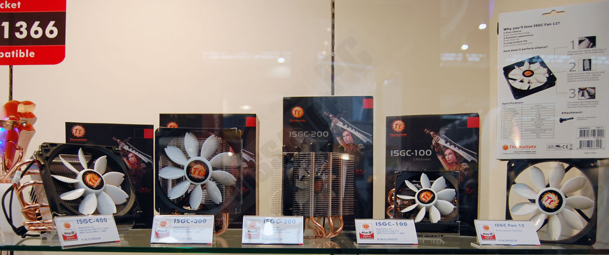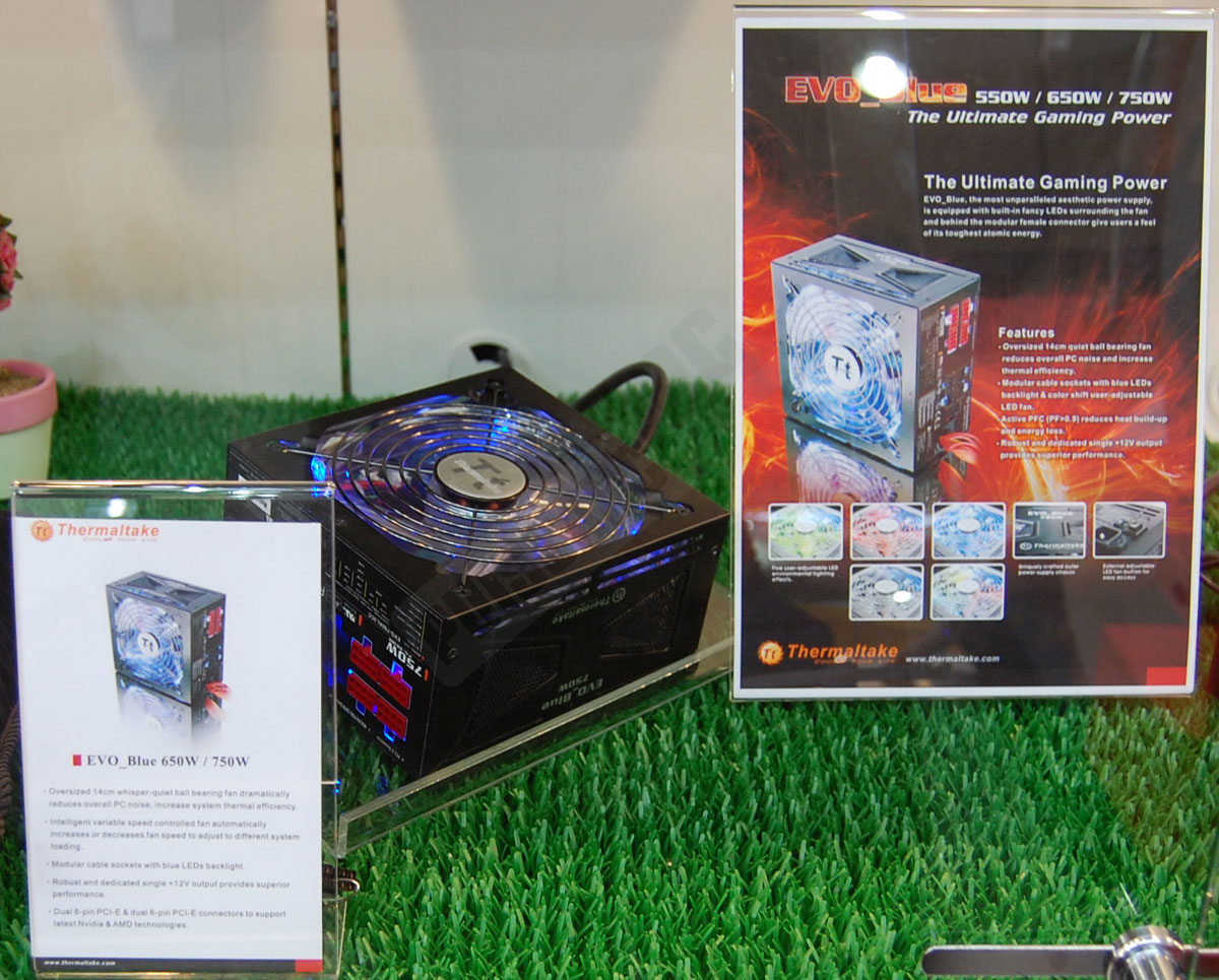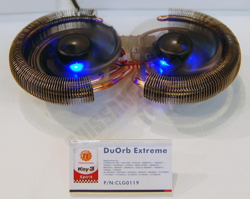 Quelques nouveautés étaient présentes sur le stand de Thermaltake. On note ainsi l’apparition du DuOrb Extreme, version plus imposante du DuOrb et possédant désormais 4 caloducs au lieu de 2. Une transformation qui selon la marque devrait permettre au nouveau venu de refroidir n’importe quelle carte monoGPU actuelle, que ce soit la HD4870 ou la GTX 285 par exemple. Les ventirads CPU ne sont pas en reste également, avec toute une nouvelle gamme basée sur le nouveau ventilateur silencieux de la marque, le ISGC avec ses pales en forme de pétales de fleurs. Nouvelle gamme d’alimentation également : les EVO_blue. Disponibles en 550, 650 et 750W, elles sont modulaires, disposent d’un rail unique de +12V et d’un ventilateur de 140mm de diamètre pour un meilleur refroidissement. Des arguments intéressants mais qui ne valent pas le plus important de tous : le ventilateur peut s’éclairer de 5 couleurs différentes grâce à un bouton placé à l’arrière de l’alimentation. Il ne vous restera plus qu’à installer une boule à facettes dans votre boîtier et vous pourrez revivre les plus belles heures du Disco. Merci qui ? Merci Thermaltake ! Photos en suite de news comme toujours.