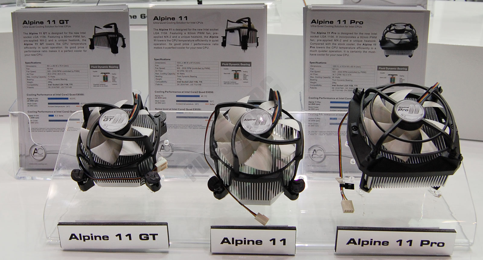 Ils font une apparition timide lors de ce CeBIT, et pour cause : la plate-forme LGA1156 n’est pas attendue avant le 3è trimestre. Pourtant Arctic Cooling est fier d’afficher lors du salon 3 modèles d’ores et déjà compatibles : les Alpine 11, 11 GT et 11 Pro.