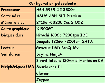 Concernant la carte graphique nous avons prix une X1900GT qui, avec sa consommation mesurée par les différents tests du net aux alentours de 75W en charge, est elle aussi la plus gourmande de sa cétagorie (65W une X1950Pro, 45W une 7900GS par exemple).