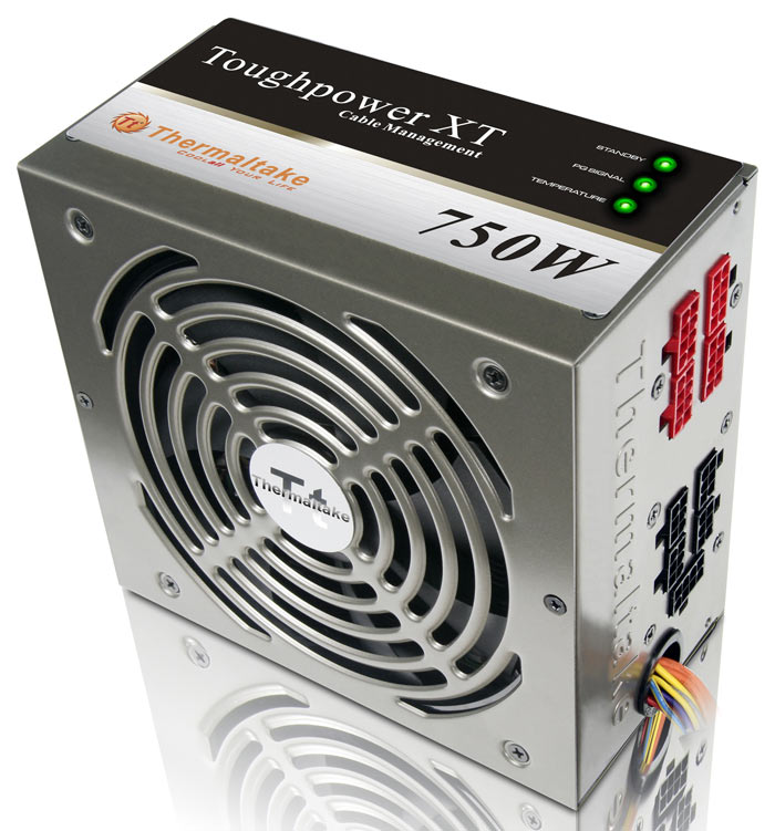 Thermaltake qui distribuait des marteaux gonflables au CeBIT va lancer 3 nouvelles alimentations appartenant à la nouvelle gamme Toughpower XT. Elles sont certifiées 80+ bronze et sont modulaires. Le ventilateur unique de 140mm s’occupera de refroidir les composants internes à l’alimentation, et selon TT le ventilateur continuera à tourner 30 secondes après l’extinction du PC afin de refroidir les éléments grâce à la technologie Fan Cool Delay. Pour terminer elles ont un rail unique +12V dont l’intensité (de 52 à 62A) est fonction de la puissance globale du modèle. Elles arrivent avec une garantie de 5 ans et des puissances de 650, 750 et 850W pour des prix respectivement de 154, 168 et 230€. Cliquez sur l’image pour l’agrandir.