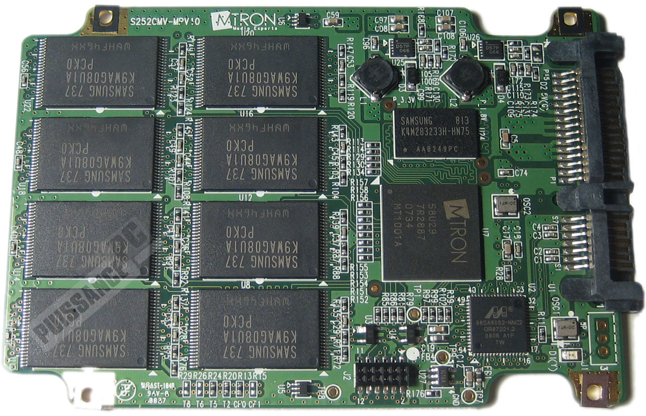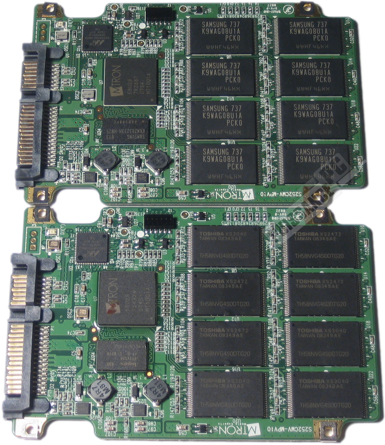 Les 2 SSD du jour utilisent de puces flash NAND de type SLC (Single Level Cell) plus performantes et endurantes (100 000 cycles d’écriture contre 10 000) que les MLC (Multi Level Cell), mais aussi bien plus chères. Le contrôleur utilisé pour la gestion de ces dernières n’est pas le tristement célèbre JMicron JMF602 ou le prometteur Indilinx Barefoot, mais un modèle propriétaire constitué d’un processeur ARM7 (et de mémoire SRAM) programmé en guise de contrôleur à 4 canaux. C’est relativement peu en comparaison des 10 d’Intel, mais Mtron a annoncé fin 2008 une évolution de son contrôleur avec 8 canaux mémoire pour des débits de l’ordre de 260 Mo/s et une optimisation des écritures aléatoires en 4 Ko, traditionnel point faible des SSD. Autant vous dire que l’on a hâte de tester un SSD employant ce contrôleur… Mais revenons à nos moutons, une fois débarrassés de leur coque voici nos SSD :