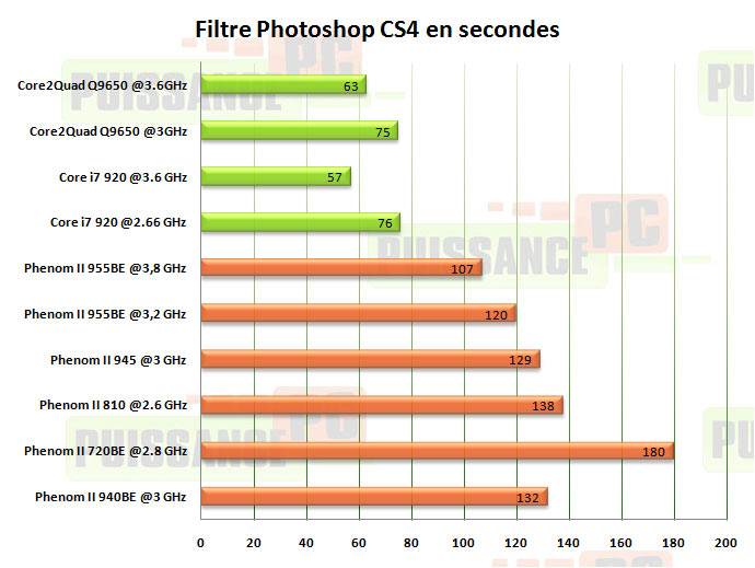 Même sentence avec en plus cette fois un Hyperthreading plus efficace du Core i7 par rapport au Q9650. On voit qu’avec le SSE4 il est difficile de conseiller un Phenom II alors qu’en fait il ne s’en sort pas si mal, mais voilà la comparaison avec les CPU Intel est douloureuse ici. Un choix de développement par ailleurs fort logique de la part d’Adobe dont le coeur de cible travaille souvent sur plateformes Apple, et donc par extension Intel x86.