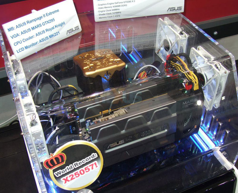 La GTX 295 modifiée signée Asus, la Mars que nous vous présentions la semaine dernière, est forcément l’une des attractions du salon. Asus présente d’ailleurs même une configuration équipée de deux de ces cartes qui n’ont de GTX 295 que le nom, de quoi faire faire rêver les amateurs de performances extrêmes avec au final un quad SLI de GTX 285, rien que ça ! Une configuration hors normes, détentrice d’ailleurs du nouveau record du monde à 3DMark Vantage avec un score de X25057, une fois passée entre les mains de l’overclockeur Kinc qui a poussé les deux GTX 295 Mars à 833/1861/2558 (gpu/shader/ram). Pour les plus curieux une carte était également décortiquée, découvrez tout cela en suite de news. (Source HeXus)