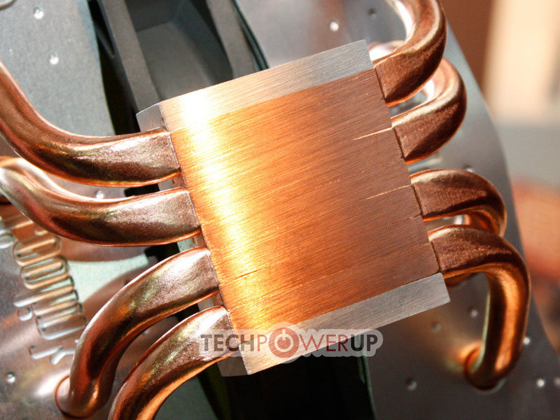 Ceux qui suivent de près l’évolution des ventirads n’auront pas manqué de remarquer que si la technologie "Heatpipes Direct Touch" (en bon François "à caloducs exposés") a des avantages certains en permettant à la chaleur de passer directement du CPU aux caloducs, sans avoir à traverser une base de radiateur en cuivre, elle a également des inconvénients. L’un des plus souvent cités est l’état de surface de la base du ventirad, car les caloducs ont beau être serrés les uns par rapport aux autres et écrasés, il demeure des interstices assez marqués, comme par exemple sur le Vendetta 2 d’OCZ. Coolink présentait pourtant un ventirad Direct Touch ne semblant pas souffrir de ce problème lors du Computex. A sa base on retrouve bien 4 caloducs "écrasés", le nombre classique actuel pour les ventirads de ce type, mais la firme a inséré tout de même une très fine épaisseur de cuivre afin d’homogénéiser la surface en contact avec le heatspreader du processeur. On pourrait dès lors dire qu’il ne s’agit plus vraiment de caloducs exposés, mais le résultat reste à peu près équivalent, rien à voir en tout cas avec une base "normale", laissant généralement au moins 2mm d’épaisseur de cuivre à traverser avant d’atteindre les caloducs. Nous avons plutôt là affaire à quelques dixièmes de mm seulement ! Il reste à attendre des tests, coup de maître ou coup dans l’eau, les paris sont ouverts. (Source TechPowerUp)