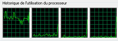Déception avec l’utilisation pleine du potentiel du Q6600 et de ses 4 cores, puisque le framerate reste identique à une demi image par seconde près par rapport à 2 coeurs. Le jeu ne serait-il pas capable d’exploiter plus de 2 cores ? Le graphe d’utilisation nous montre que les 4 coeurs sont utilisés par Street Fighter 4, mais en revanche très peu, de l’ordre de 30 ou 35% pas plus Le résultat au final est une utilisation CPU "globale" équivalente à celle rencontrée juste avant. Au lieu de 2 coeurs utilisés à 70%, nous en avons 4 environ à 35%. Il est alors logique dans ces conditions de n’observer aucun gain. Et ce cas de figure est en fait typique des applications qui ne gèrent en réalité pas le multicoeur en question. Street Fighter 4 gère donc 2 coeurs mais pas 4, comme malheureusement beaucoup de jeux encore à l’heure actuelle.