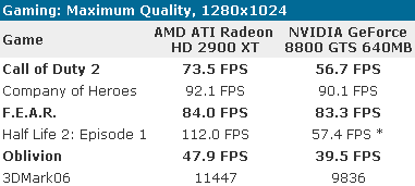 Il ressort de ces chiffres une avance de la HD 2900 XT allant de 1 à 30% en fonction des jeux, ce qui devrait donc la placer au coude à coude avec la 8800GTX.