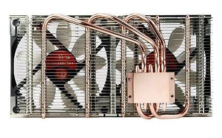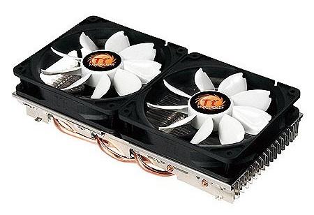 Thermaltake vient en effet de dévoiler l’ISGC-V320, il s’agit d’un ventirad pour carte graphique équipé de deux ventilateurs. Il mesure 241 x 125.4 x 63 mm pour un poids de 738g et est constitué d’une base en cuivre ainsi que cinq heatpipes de 6mm qui amèneront la chaleur à un grand radiateur. Ce dernier sera refroidi par deux ventilateurs de 120mm qui fonctionneront entre 800 et 1300tpm pour des nuisances sonores de 16dB(A) (chaque ventilateur). La compatibilité est très très large, allant de la série 7900 (7900GT/GTX/…) aux dernières GTX (285/275/…) en passant par les 8800 et 9600 chez nVidia ainsi que de la X1900XT à la toute dernière HD 4890 chez Ati en passant par les hd3000 et hd4600. Pour vérifier si votre carte fait parti du lot, la liste complète de la compatibilité est disponible ici. Pas de prix ou de disponibilité pour l’instant, mais une série de photos vous attend en suite de news.