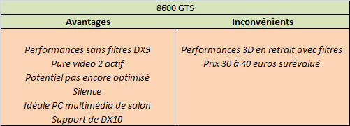 - Sur la question des performances, nous ne sommes pas catégoriques, puisqu’en l’état actuel, le 8600 GTS tient son rang en l’absence de filtres. Cela en fait assurément une carte tout à fait correcte pour le joueur occasionnel, celui qui ne souhaite pas passer 15 minutes à choisir des réglages, et encore 30 pour les affiner. De plus l’implémentation du Pure Video2 qui est cette fois-ci bien réelle et performante en fait une carte de choix plus "multimédia" et conviendra dans un mini PC dédié à cet usage.