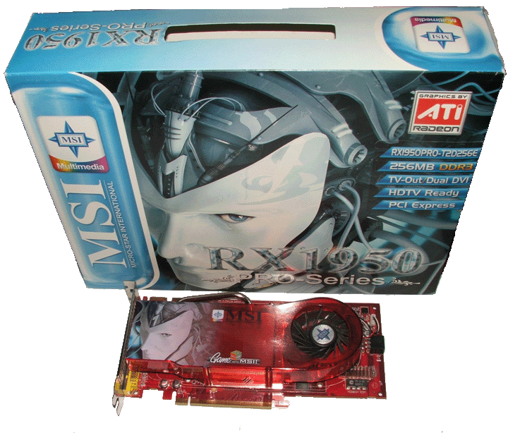 MSI RX1950 PRO-T2D256E : La caractéristique principale de cette carte est le ventirad made in MSI. En effet , à l’instar des anciens ATI Silencer, la carte est double slot et expulse l’air chaud hors du châssis, dans un silence très agréable. Seul le ventilateur émet un bruit de rotation qui se perçoit et qui est assez pénible, bien qu’il soit trés faible dés lors que l’on tend l’oreille. Dans le cadre d’une configuration silencieuse, il peut être le maillon faible. Le RV570 a besoin de Watts, aussi cette carte a besoin d’être épaulée par une alimentation supplémentaire comme ses consoeurs. Je remercie également PYDIDI, le célèbre rappeur de Baillargues pour le prêt de cette carte (merci mon poulet !).