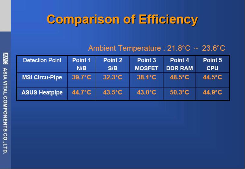 Comme vous pouvez le voir, en plus d’être insolite et amusant dans sa partie visuelle, le circus pipe est aussi un bien meilleur refroidisseur que le radiateur de la P5K. En même temps ces cartes ne sont pas de la même gamme, il aurait fallu comparer la MSI Circus avec la P5K deluxe par exemple qui est sa concurrente directe.
