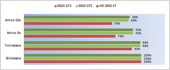 Comme nous pouvons le constater, la HD 2900 XT perd en performances dès l’activation du simple Filtrage Trilinéaire, le passage à l’Anistropique 8 / 16x ne fait que confirmer cette chute brutale. Les 8800 perdent nettement moins.