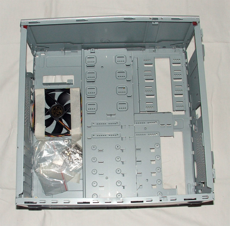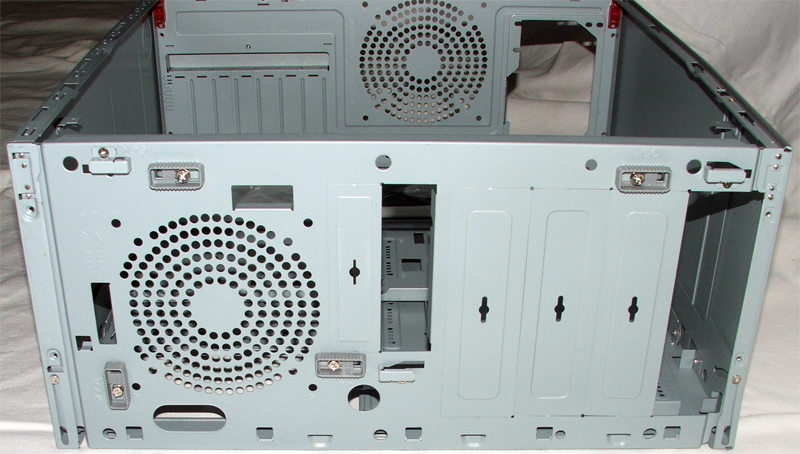 Nous voyons bien que le boitier a souffert du transport sur cette dernière photo. Nous voyons aussi l’emplacement prévu pour deux ventilateurs de 120mm sur la face arrière du châssis ainsi que sur la face avant. Nous voyons pour terminer que se cache aussi un ventilateur de marque Yate Loon fourni ainsi que toute la visserie adéquate. Ainsi ce châssis devrait remplir son rôle correct de ventilation. Sont visibles également les 4 réglettes de blocage de la cage à disque.
