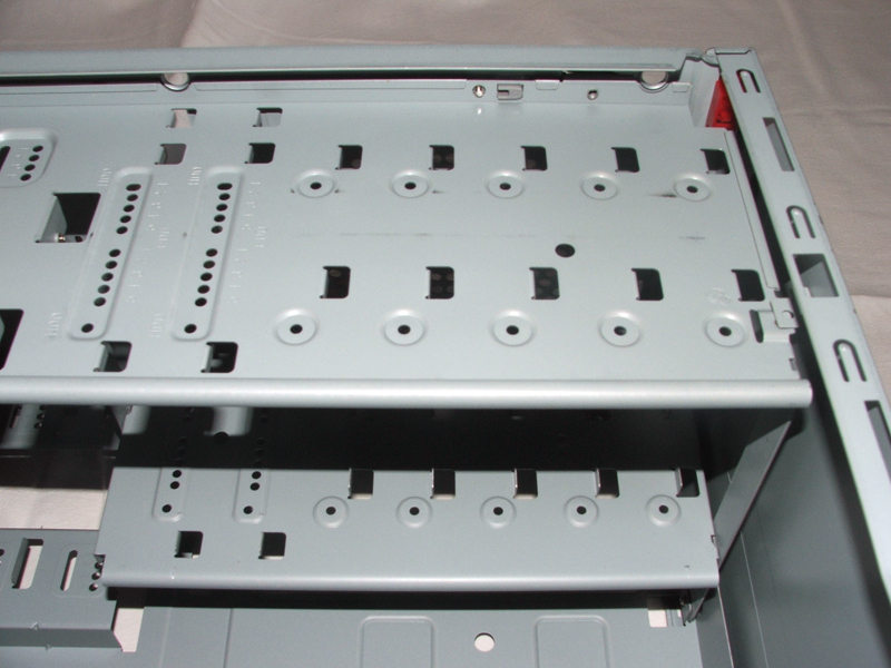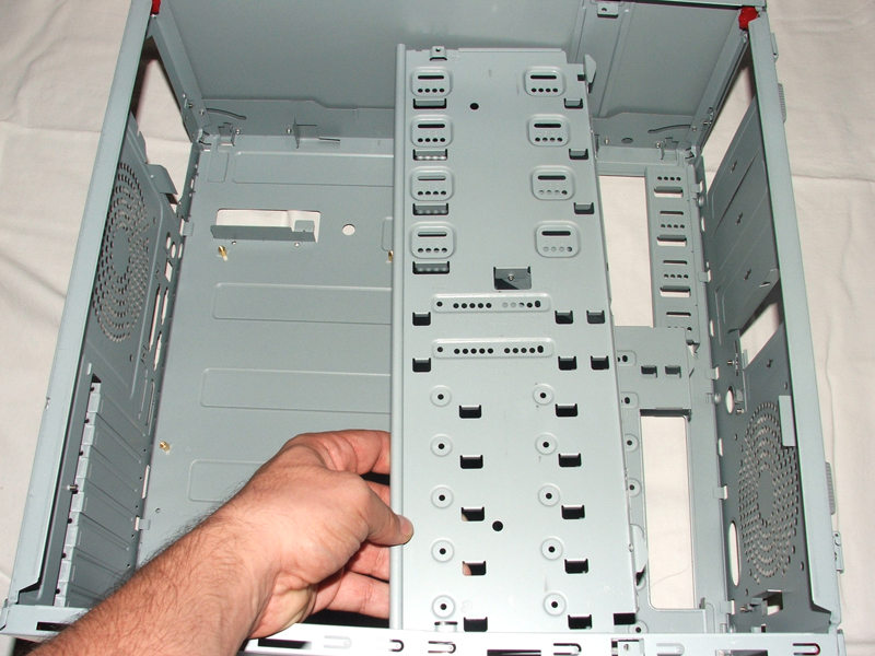 Grâce à mes doigts musclés, on peut voir que la cage de périphériques pivote vers la face avant sans le moindre effort. elle s’emboite aisément au moyen de détrompeurs, et il faut 2 vis à ajouter pour stabiliser l’ensemble, en plus des 4 réglettes qu’il faut locker.