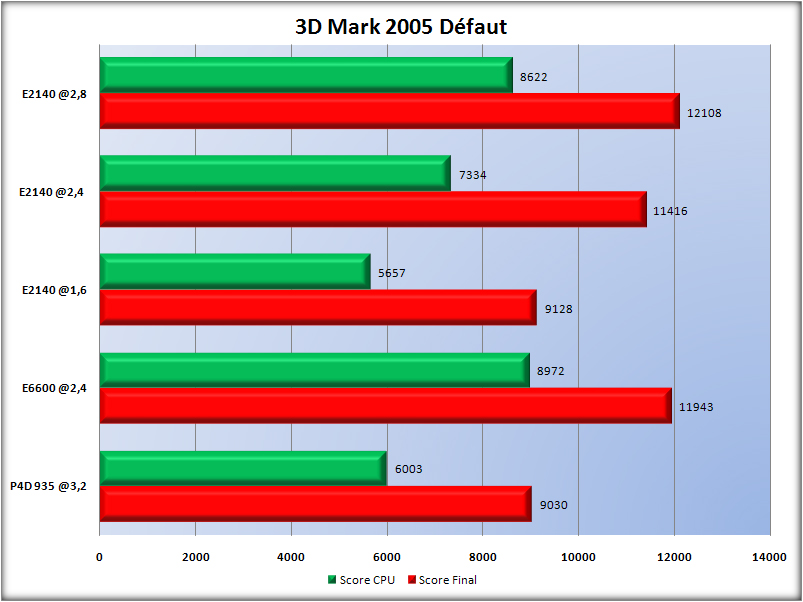 Analyse : Dans les deux benchmarks, le E2140 se trouve toujours devant le D935, bien que le score CPU soit toujours inférieur. Ce qui montre que l’architecture core telle qu’elle est est pensée pour le jeu. Néammoins sur 3DMark2005, on voit que les 1.6 GHz et dans une moindre mesure le mega de cache brident les performances de la carte. Le test se faisant en 1024 et sans filtres, nous restons dans le domaine du CPU limited pour le X1900XTX. Sur 3DMark 2006, c’est moins évident, car le score CPU E2410 est plus faible que le score CPU du D935, mais les scores GPU ne varient pas, nous sommes dans le domaine du GPU limited. En effet tous les scores montent quand on o/c le processeur, mais seul le score CPU varie, la carte affichant sensiblement les mêmes scores GPU. Pour résumer la situation, les scores CPU sont intéressants, et encore, plus on monte la fréquence et meilleurs sont les scores CPU. Les scores finaux augmentent évidemement car ils incluent le score CPU, mais la carte affiche les mêmes résultats ici : GPU limited sur le 3DMark2006.