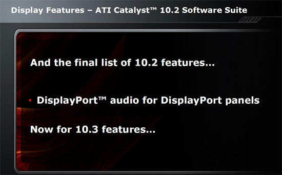 Un dernier slide de présentation au sujet des Catalyst 10.2, qui ne nécessitera pas de s’étendre, tout comme l’a d’ailleurs fait AMD lors de sa présentation : le DisplayPort audio va faire aussi son apparition ce mois-ci.