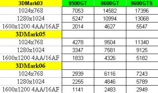 Scores 3DMarks des 8500GT, 8600GT et 8600GTS